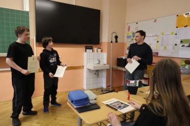 Einer schönen Schultradition folgend ging auch in diesem Jahr die Schulleitung zur Ausgabe der Halbjahresinformationen durch alle Klassen. Wettbewerbsurkunden wollten verteilt werden und unser Förderverein unterstützte dies mit kleinen Preisen. Frau Lutz zeichnete die Klassen im Wettbewerb "Schönstes Klassenzimmer" aus. Über die Pizzalieferungen freuten sich die 9a und 8a. Herr Martens übergab die Zertifikate an die ausgebildeten Medienscouts und Herr Dreyer kam wie gewohnt mit den Urkunden zur Schulstufe vom Sächsischen Informatikwettbewerb. Dazu kamen noch individuelle Bemerkungen zu den Klassen und an alle der Wunsch für schöne, erholsame Ferientage.