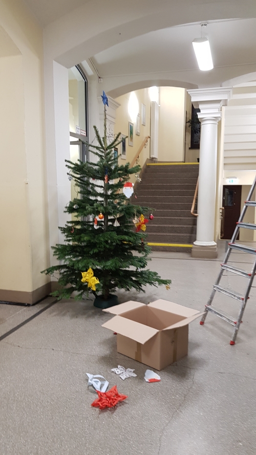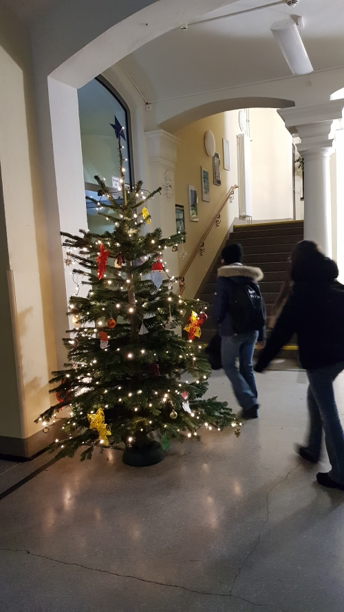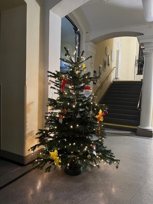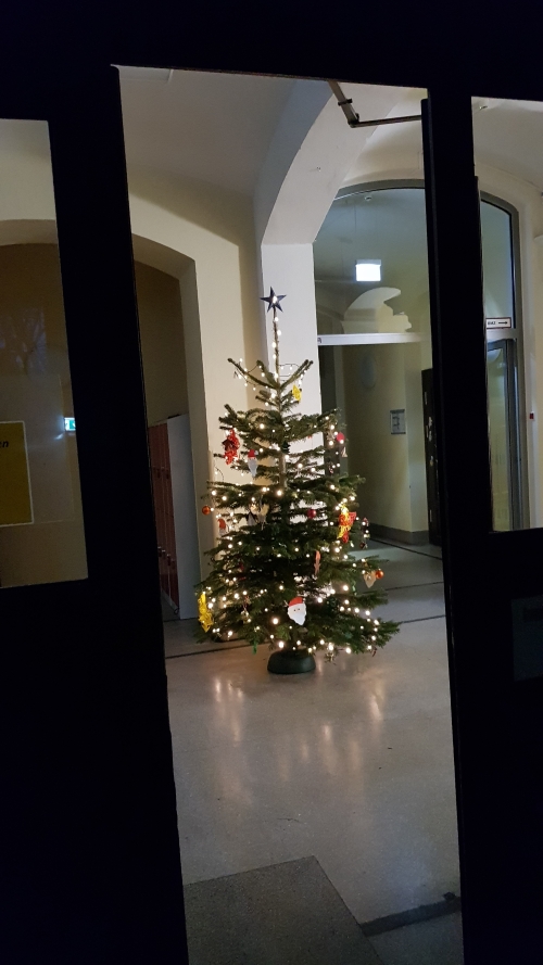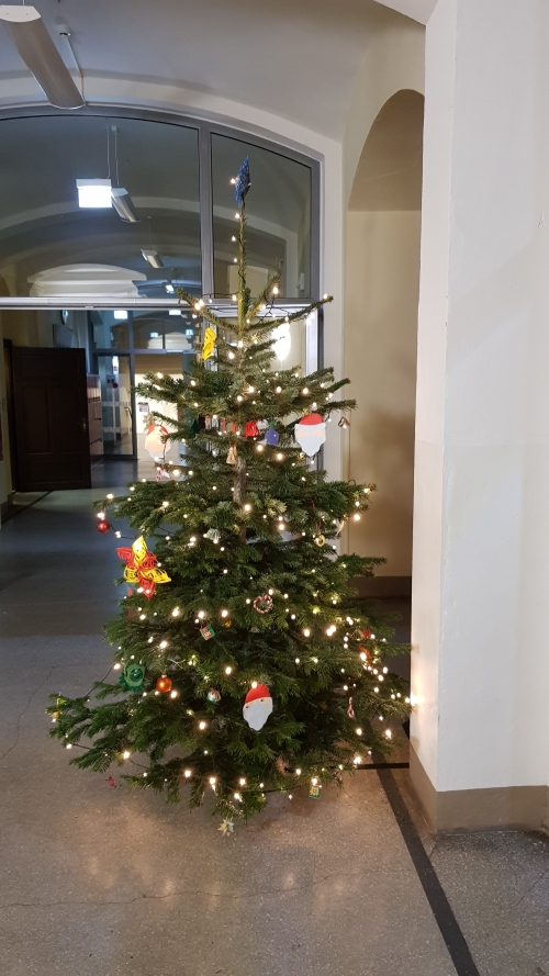 Übrigens: Beim Schreiben dieser Zeilen hört man Kindergemurmel mit Weihnachtsliedchen bis ins Sekretariat. Also kommt der Baum bei unserer Schülerschaft gut an!