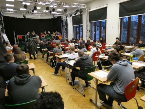 Gemeinsam wurden die Vorprüfungen gut organisiert. Schnell waren die Schülertische im Saal (Dank an 10a + 10c) und die Lehrer kümmerten sich um die vielen kleinen Dinge, die man nicht so sieht: Aufgabenauswahl, Druck, Hördateien bereitstellen (funktioniert die Technik?) usw. Besonders in den Naturwissenschaften war da viel zu klären und abzustimmen. Danke Frau Lutz für die Organisation der drei Fächer und auch an unsere Gastlehrerin Frau Bergmann, die von einer anderen Schule sogar am Prüfungstag kommen durfte und zuvor noch spätnachmittags nach ihrem Unterricht an der Stammschule Material bereitstellte. Danke Frau Busch für das nicht leichte Einarbeiten in der Physik. So hatten die Schüler gute Bedingungen.