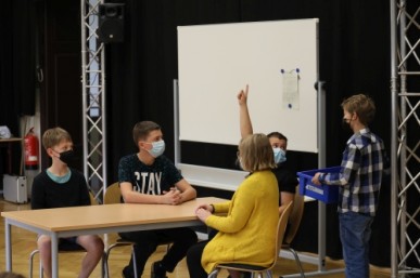 Mit einem kleinen Programm der Sechstklässler werden unsere neuen Fünftklässler jedes Jahr im Saal begrüßt. Diesmal stellte die 6b der 5b das Schulleben in kleinen Sketchen vor. Nach einführenden Worten unserer Schulleiterin Frau Bräutigam spielten die Schüler auf. Toll gemacht! Da kann sich die 5a noch auf das Stück der 6c (leider kurzfristig ausgefallen) freuen. Unsere 6a stellte ihr Stück am Schuljahresende den großen Schülern vor.