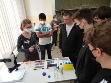 Die Schülerinnen und Schüler konnten einen Einblick in biologische Grundlagenforschung gewinnen. Dazu brachten die Wissenschaftler aus verschiedenen Dresdner Laboren u.a. Polypen und Augenquerschnitte der Maus mit, um ihre Forschungen in Regenerations- und Entwicklungsbiologie vorzustellen. Auch bei den Experimenten zur Zufallsdynamik und der Extrahierung von DNA aus der Banane zeigten unsere Schülerinnen und Schüler Interesse und stellten ihr Wissen in Biologie und Englisch unter Beweis, was zum Weiterlernen motivierte.