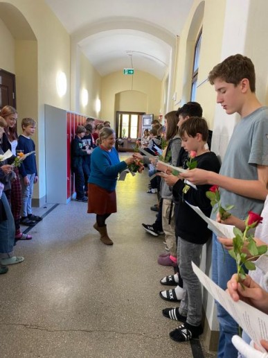 Unsere beiden 8. Klassen standen beim Auszug aus dem Klassenzimmer mit Blümchen Spalier und sangen gemeinsam mit der 9c noch einmal das Lieblingslied von Frau Gündel.