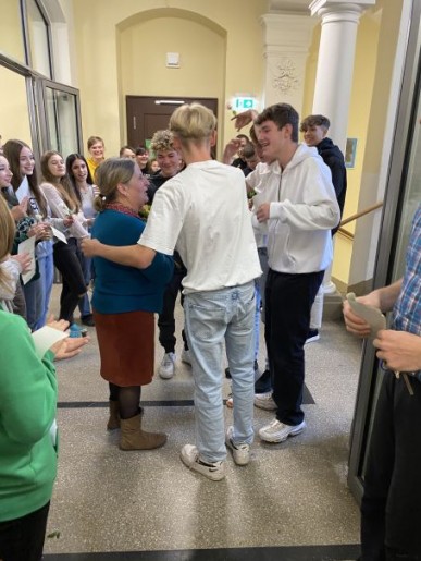 Unsere beiden 8. Klassen standen beim Auszug aus dem Klassenzimmer mit Blümchen Spalier und sangen gemeinsam mit der 9c noch einmal das Lieblingslied von Frau Gündel.