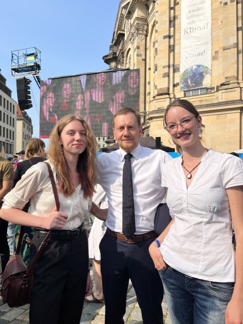 15 Uhr kamen immer mehr bekannte Persönlichkeiten und so trafen wir schließlich auch den Oberbürgermeister Dirk Hilbert. Wir unterhielten uns mit ihm über den Schüleraustausch und konnten sogar ein Foto mit ihm machen. Nachdem Frank-Walter Steinmeier und Michael Kretschmer explizit die Jugend und deren Zukunft in ihrer Rede ansprachen, nutzten Emily und ich die Gelegenheit und begaben uns regelrecht auf die Mission ein Foto mit Michael Kretschmer zu bekommen. Mit ziemlich viel Aufregung gelang es uns letztendlich ihn anzusprechen und sogar eine kleine Unterhaltung mit ihm zu führen.