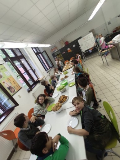 Das ganze Gemüse, welches in der Küche darauf wartete zu Gemüseburger verarbeitet zu werden, schreckte einige Kinder doch sehr ab. ""Iiiii, das esse ich nicht"", war mehrfach zu hören. Trotzdem schälten, schnippelten und raspelten die Kinder fleißig. Beim Vermengen der Zutaten verabschiedeten sich viele Gemüseschnipsel auf den Tisch und sorgten dort für ein buntes Durcheinander. Als es die Gemüsemasse dann endlich in die Pfanne geschafft hatte und der Duft den Kindern in die Nase stieg, bekamen sie ganz große Augen und stellten nun fest, dass sie doch mitessen würden, denn es sah wirklich lecker aus. Nach dem alle satt waren und die Küche so einigermaßen aufgeräumt war, musste noch das Klassenzimmer ausgeräumt werden, da die Schule in den Herbstferien grundlegend gereinigt werden soll.